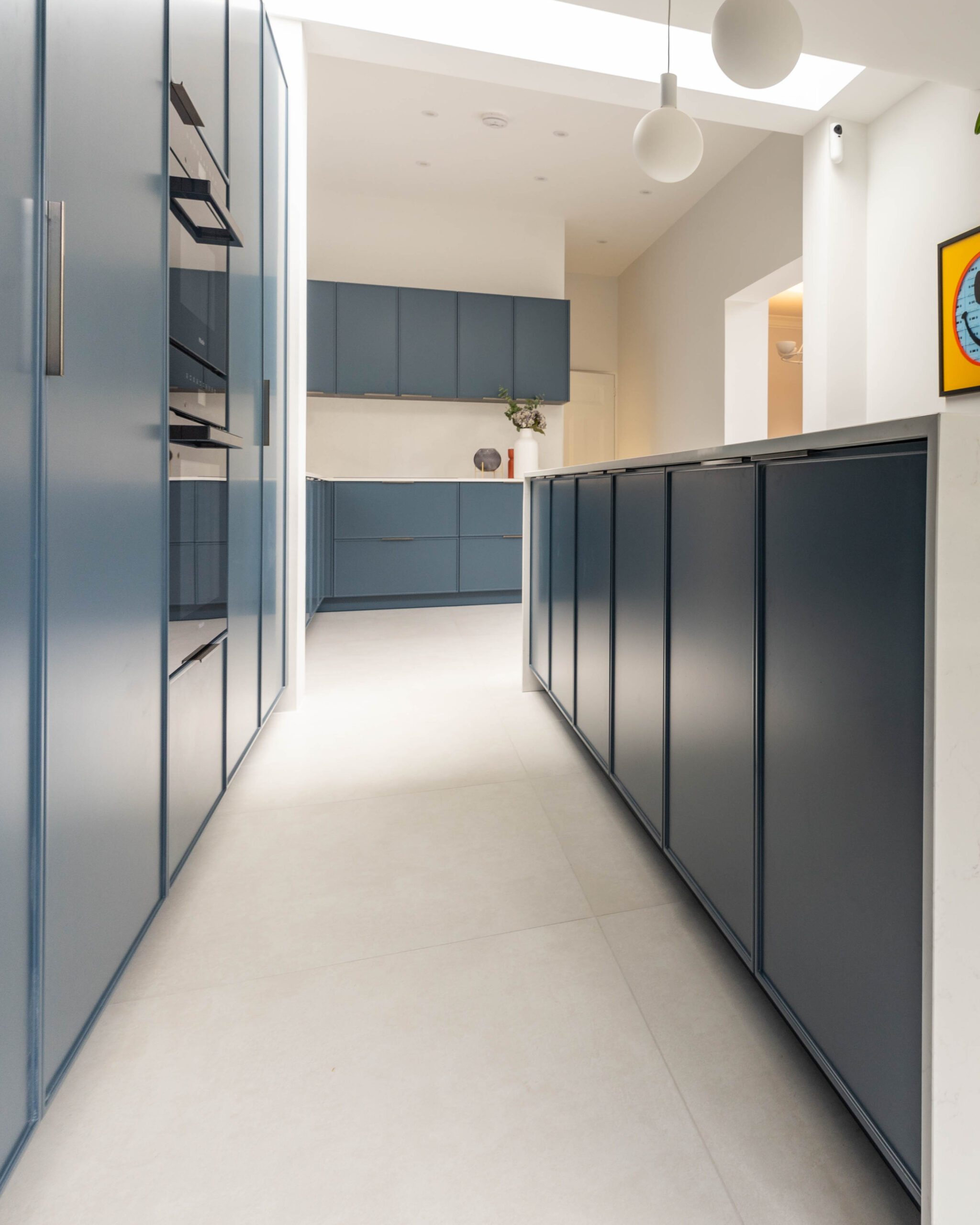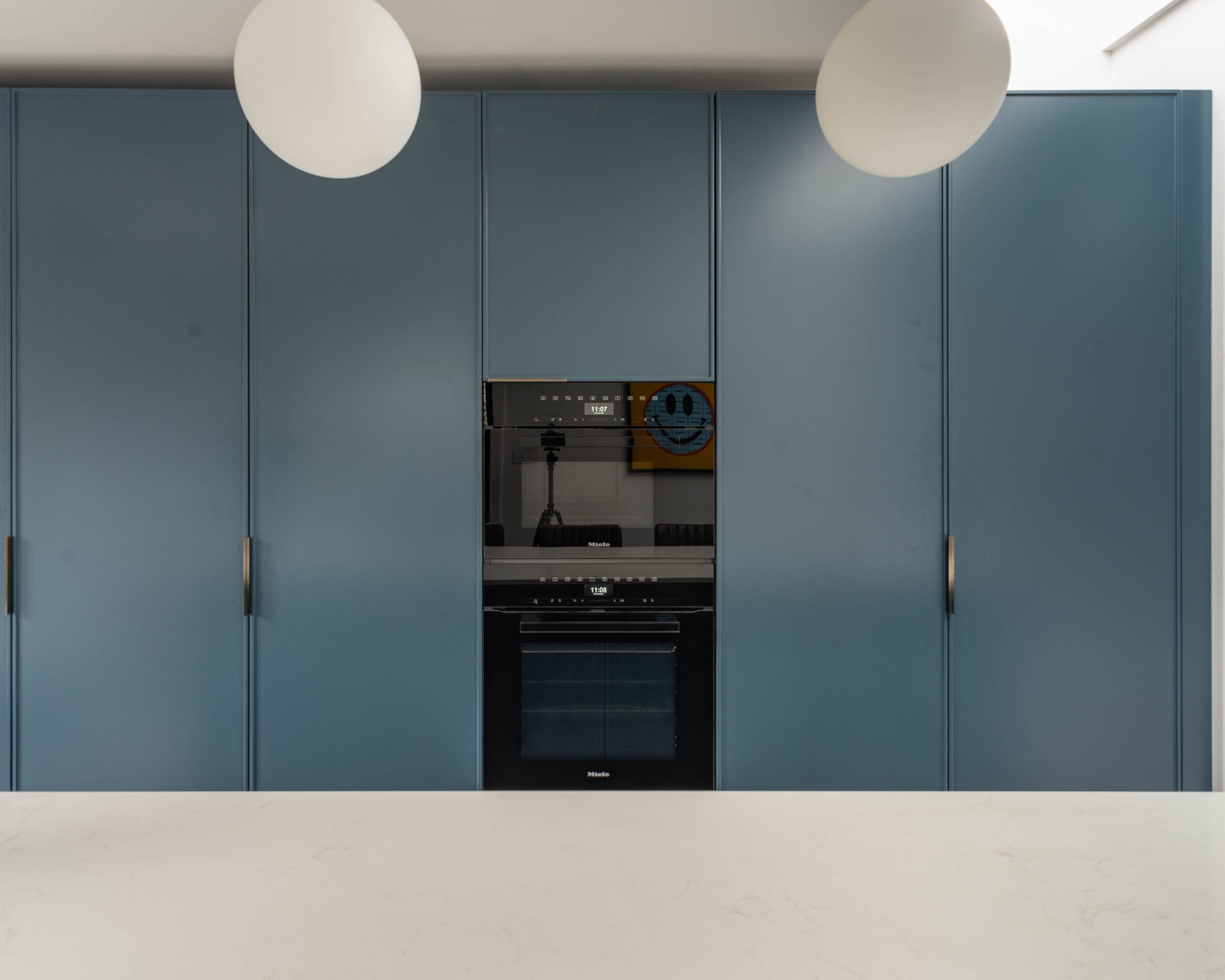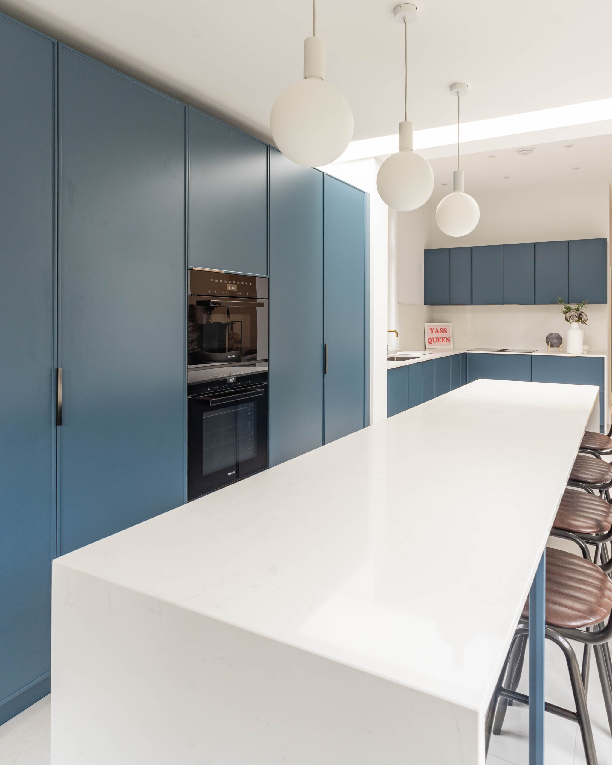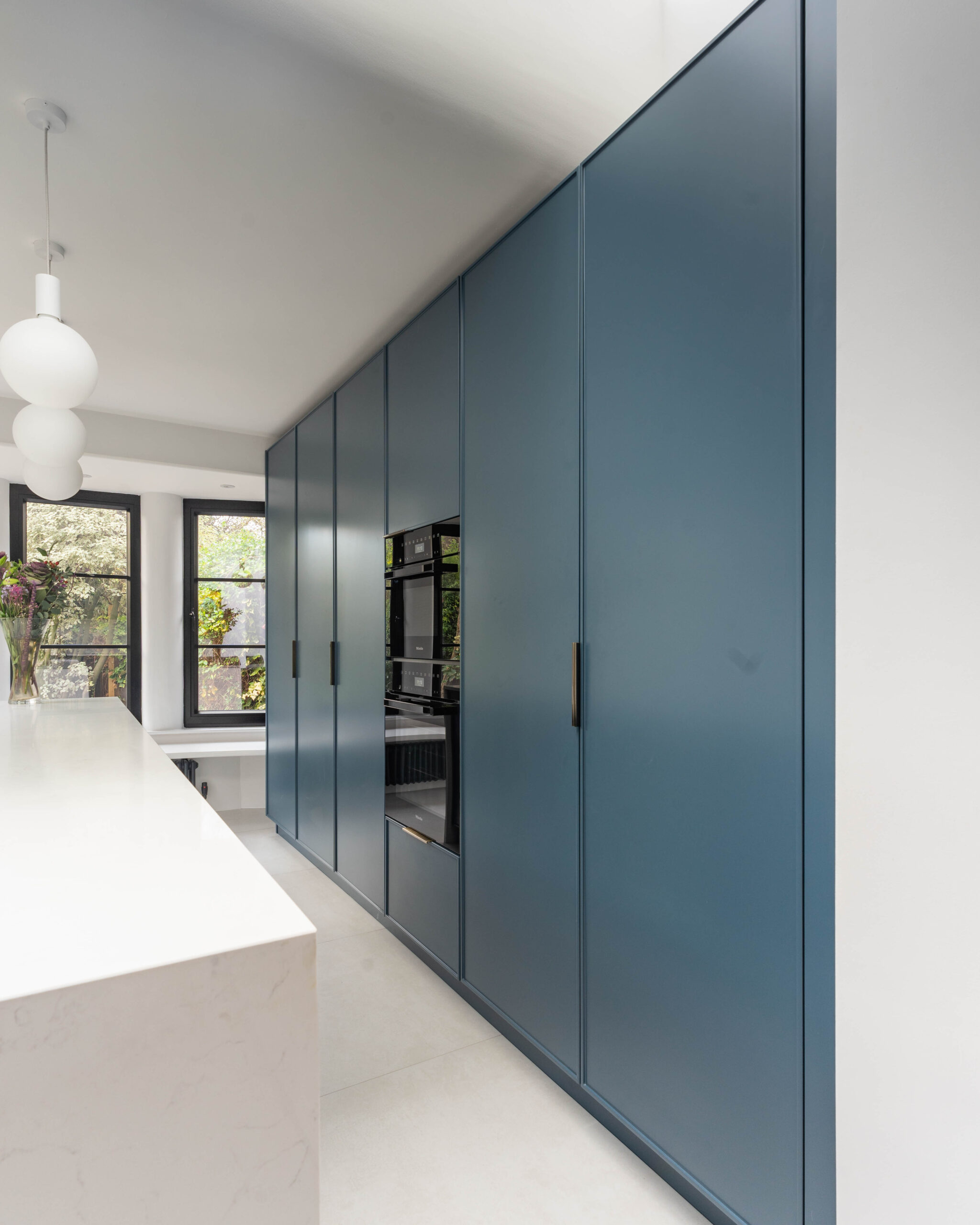 This striking Contemporary Focus kitchen uses a bold, monochrome colour scheme to create a clean, minimalist aesthetic. The entire back wall of tall units is finished in a smooth, handleless Marine Blue Matte, providing a dramatic backdrop for the integrated oven stack. This blue is sharply contrasted by the extremely long, monolithic island, which is clad entirely in clean Polar White Quartz with a waterfall edge. The design is accented by minimalist black pull handles and modern white globe pendant lights, enhancing the contemporary feel. Features also include a stylish brushed brass/gold tap near the large window, adding a touch of warmth and luxury to the bold colour blocking.