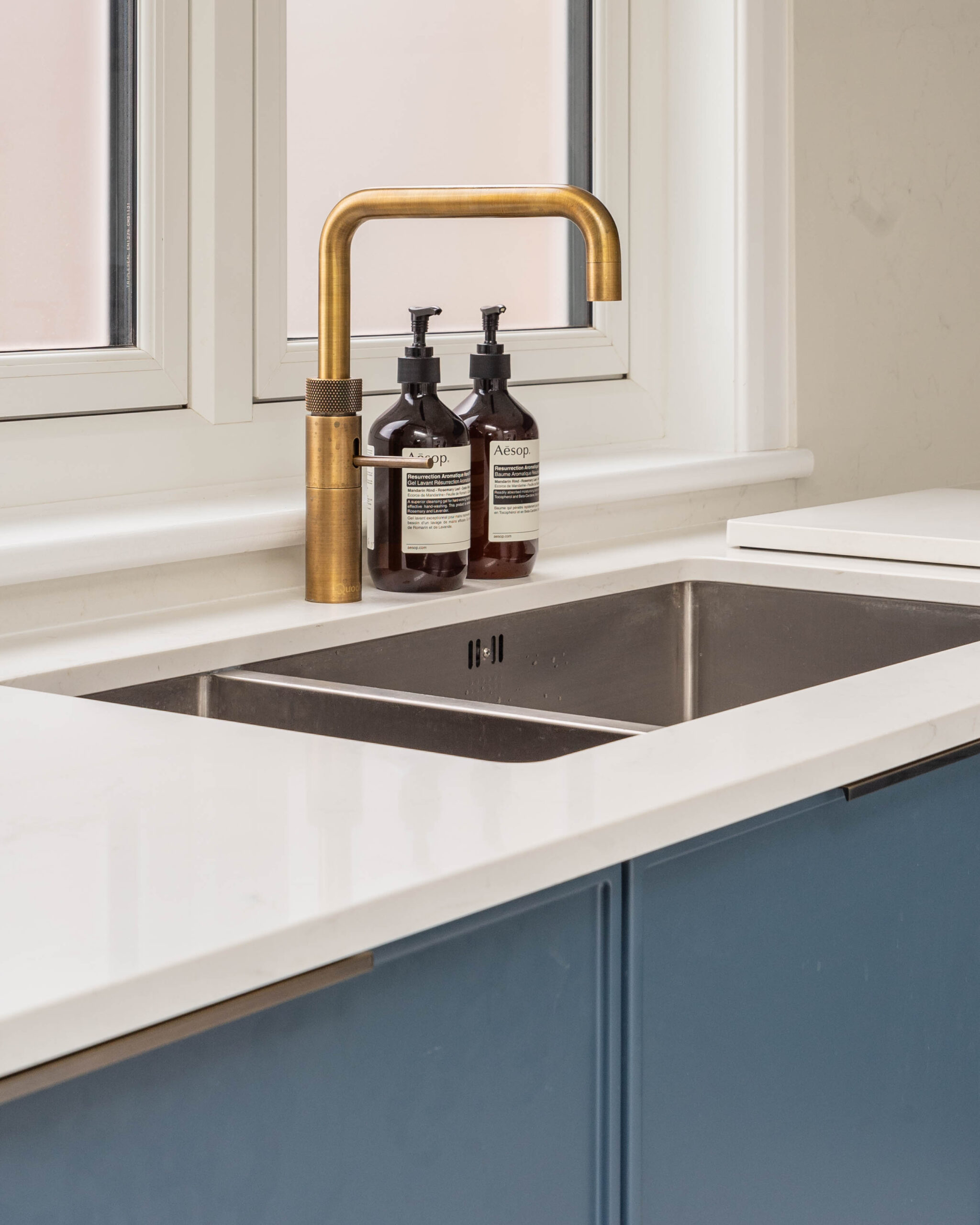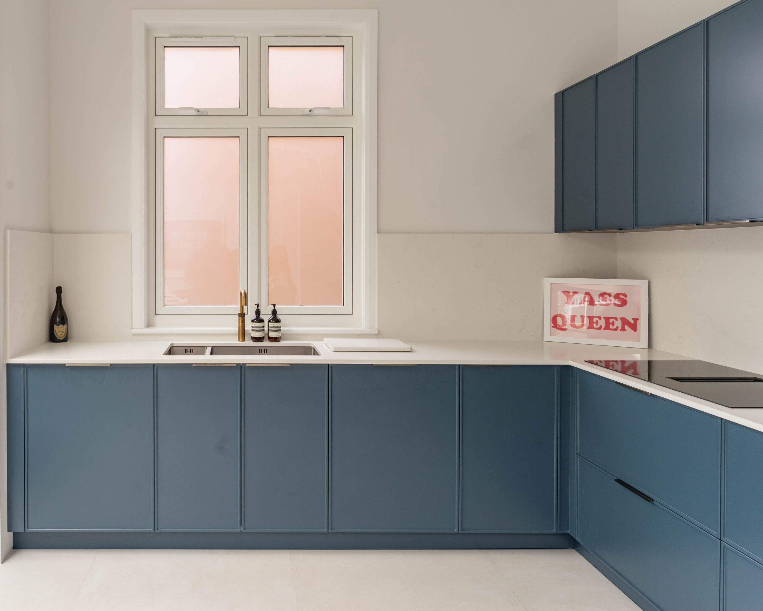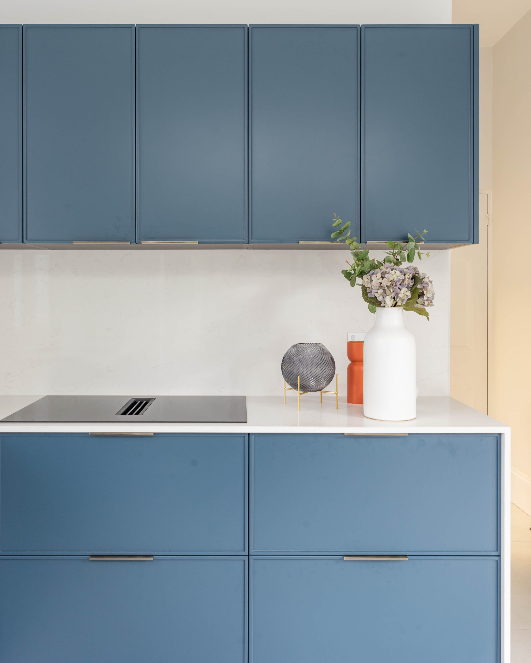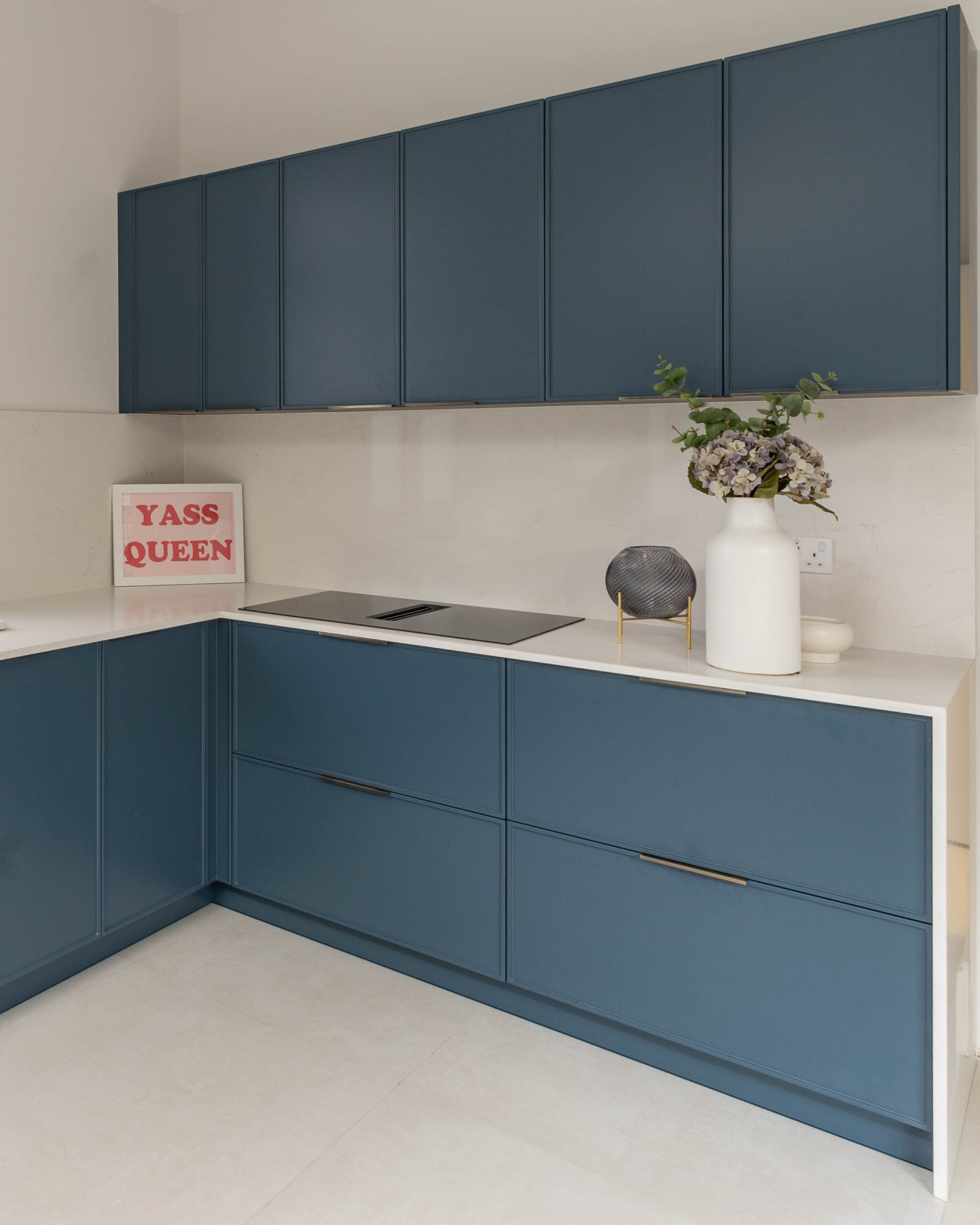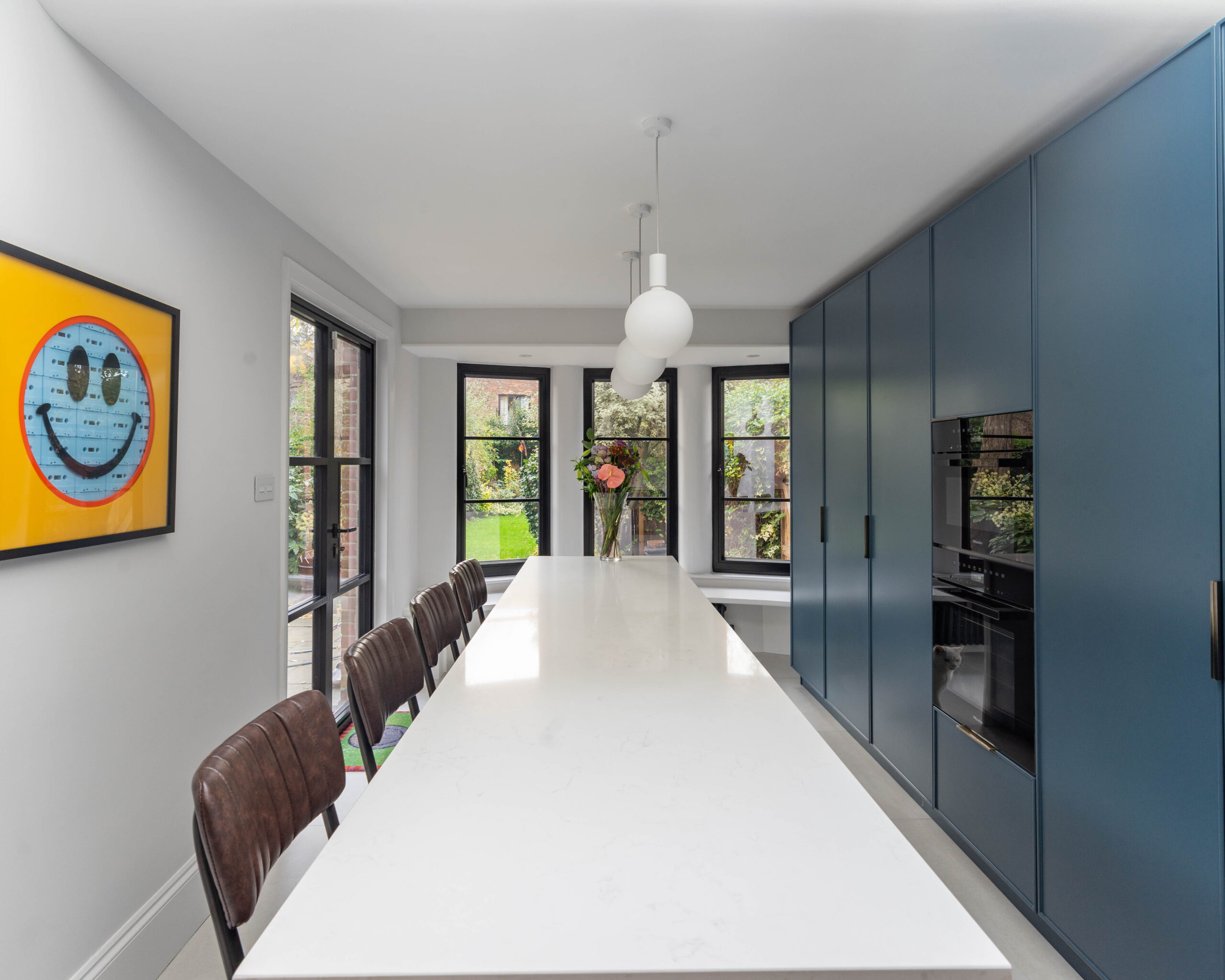 This striking Contemporary Focus kitchen uses a bold, monochrome colour scheme to create a clean, minimalist aesthetic. The entire back wall of tall units is finished in a smooth, handleless Marine Blue Matte, providing a dramatic backdrop for the integrated oven stack. This blue is sharply contrasted by the extremely long, monolithic island, which is clad entirely in clean Polar White Quartz with a waterfall edge. The design is accented by minimalist black pull handles and modern white globe pendant lights, enhancing the contemporary feel. Features also include a stylish brushed brass/gold tap near the large window, adding a touch of warmth and luxury to the bold colour blocking.